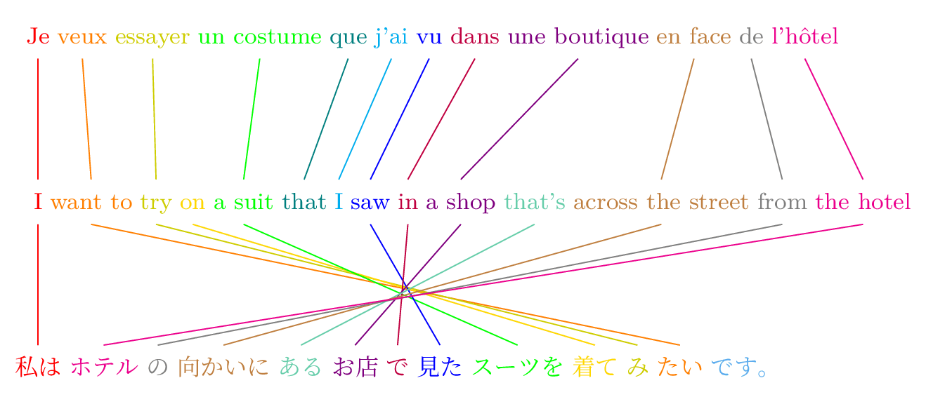 Another example is translating the sentence, “I want to try on a suit that I saw in a shop that’s across the street from the hotel”. This is a well-known sentence that demonstrates the differences between languages, as shown in the illustration below: